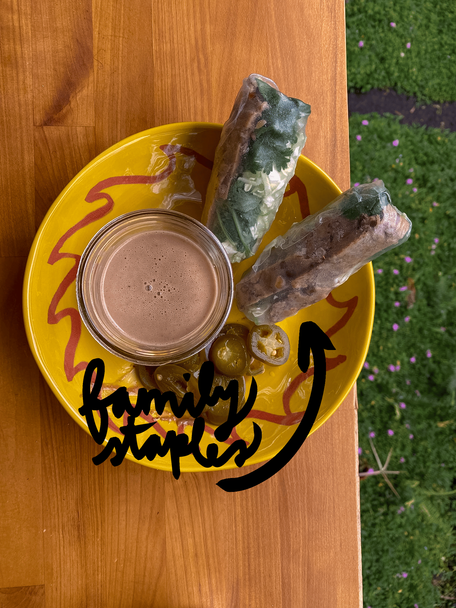 Since life has been so full and busy, we've defaulted to our family staples. For lunch, especially on days I'm solo, my go to is salad rolls with fresh herbs from the garden and our weekly meal prep. This time braised lentil seitan.