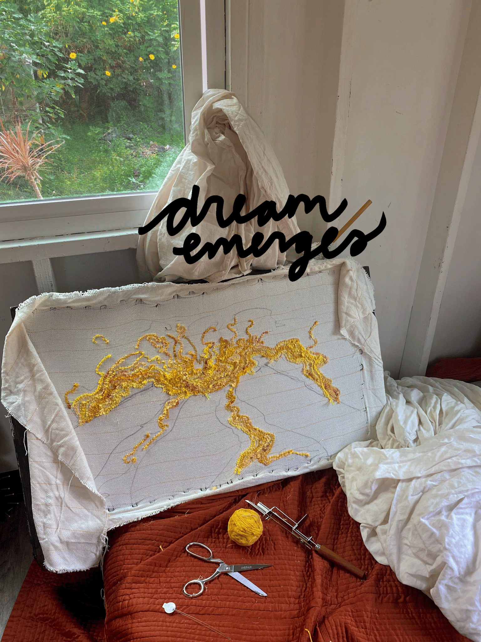 What naturally emerged when I came to the tufting frame was something soft, muted, inward, light, elusive, ethereal, distant. The opposite of the harsh realities of this storm. Dream took over where Spicy was supposed to begin. I'm learning to follow what wants to happen, not what I planned.