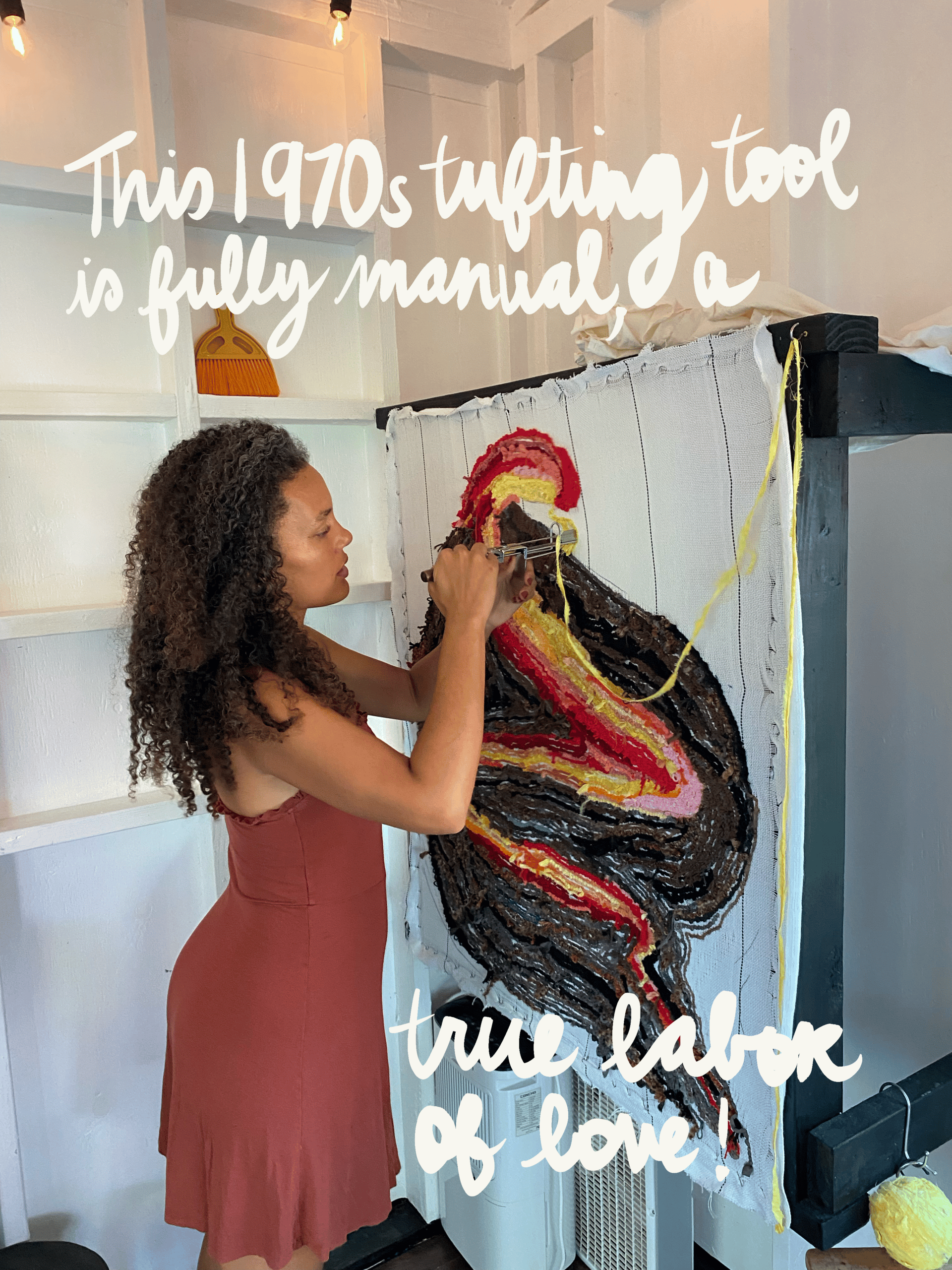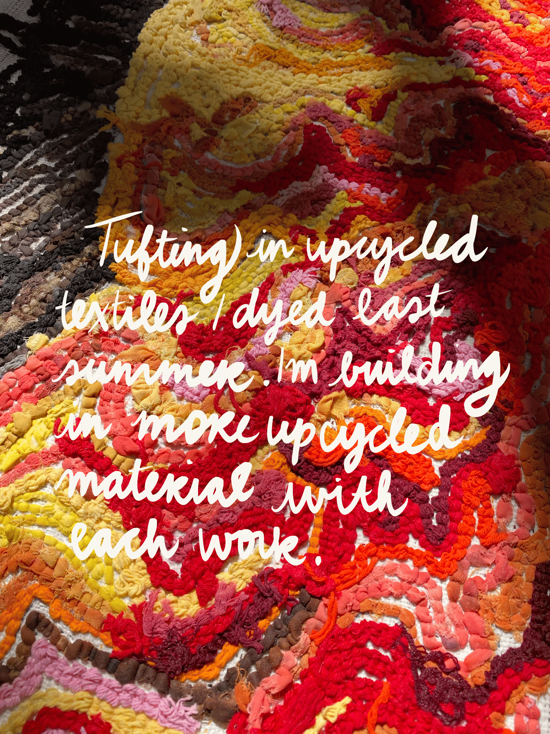 Tufting in upcycled textiles I dyed last summer. I'm building in more upcycled material with each work.