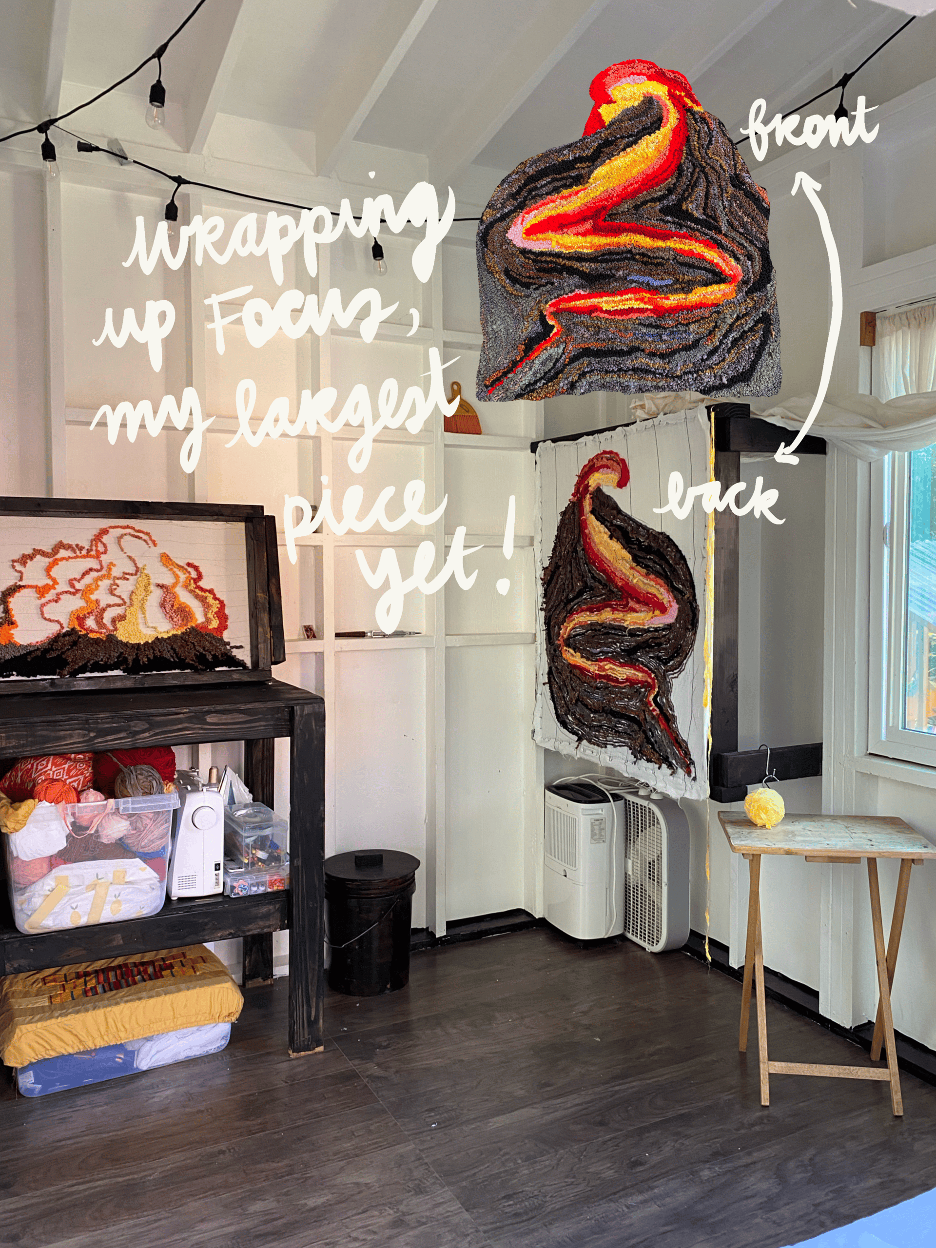 This past week was a massive one. I finished Focus, my largest piece to date. Im also sorting and decluttering the studio. I love welcoming the new year with a fresh space, it feels like a gift to present and future me. As you can see the studio is almost finished but that clear tub under Here (the current piece im working on) is overflowing. Fingers crossed that bin will receive TLC by the next Studio + Field Notes report.